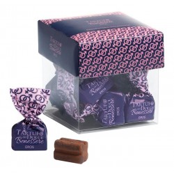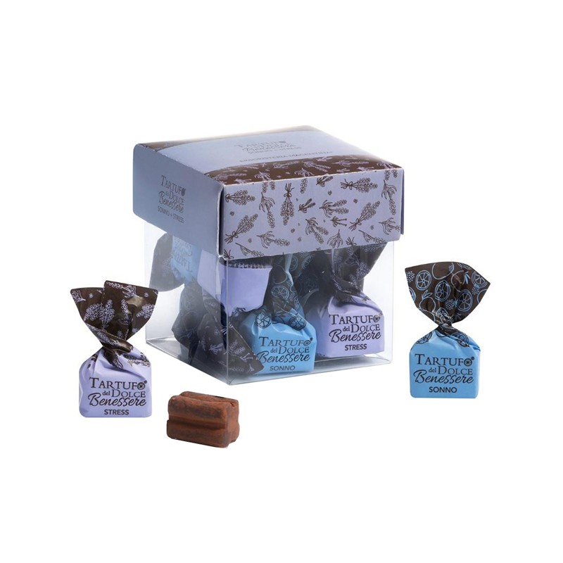 TARTUFI STRESS: Cioccolato al latte (zucchero, burro di cacao, latte intero in polvere, pasta di cacao; emulsionante: lecitina di soia; aroma naturale di vaniglia. Cacao minimo 32%), cioccolato extra fondente (zucchero, pasta di cacao, burro di cacao; emulsionante: lecitina di soia; aroma naturale di vaniglia. Cacao minimo 52%), pasta di nocciole, nocciole in granella, zucchero, cacao in polvere, canapa (Cannabis sativa L., olio dei semi), rodiola (Rhodiola rosea L., radice) estratto secco, lavanda (Lavandula vera DC.) olio essenziale.
